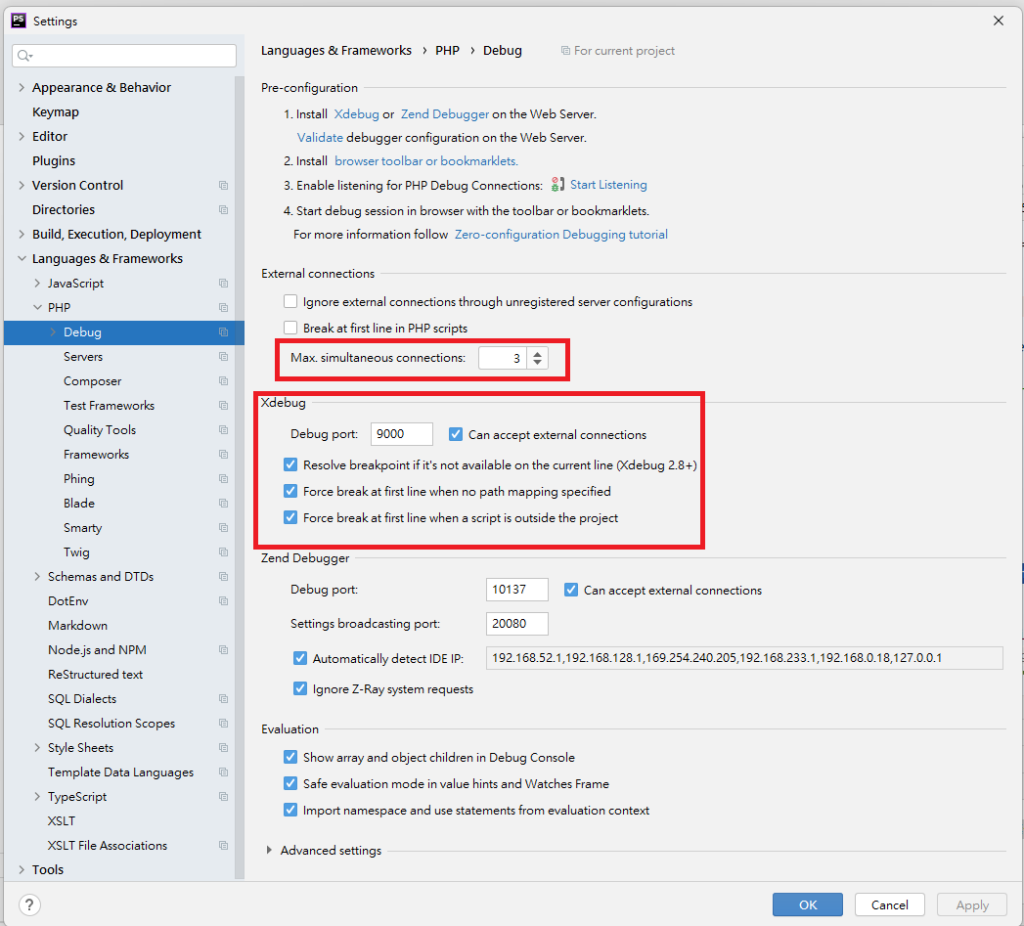xdebug.remote_port=9000 ; Default port for Xdebug 2 (PhpStorm must listen on 9000)